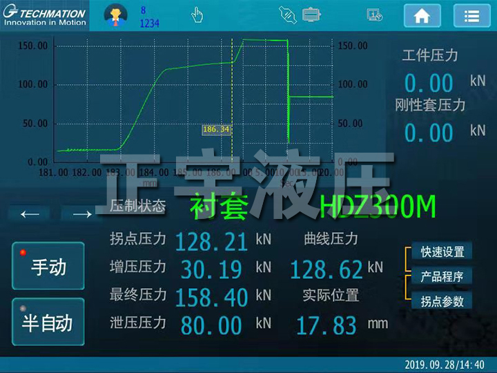 液壓機(jī)的特點(diǎn):本機(jī)器采用C型結(jié)構(gòu)上置一個(gè)液壓缸,采用高壓齒輪泵及伺服電機(jī)和驅(qū)動(dòng)器控制動(dòng)作,系統(tǒng)安裝有高精度壓力傳感器及位移控制尺。具有獨(dú)立的動(dòng)力機(jī)構(gòu)及電氣系統(tǒng),維控PLC可編程控制器編程,按鈕集中控制,西門子觸摸屏修改編制工藝參數(shù)??蓪?shí)現(xiàn)定程,定壓的工藝功能,點(diǎn)動(dòng)、單循環(huán)自動(dòng)兩種操作方式。主缸上、下限位,快慢速控制采用磁柵尺控制,在觸摸屏上設(shè)定工藝參數(shù)即可,操作簡(jiǎn)便、安全。油缸采用壓力傳感器控制,顯示壓力。